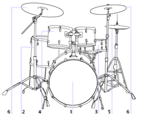 Some drummers may add a second bass drum (played by the left foot), double bass pedals (played with both feet), additional toms, more